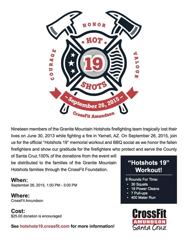 The “Hotshots 19″ workout is today! This workout will be scaled and modified as needed to ensure maximum participation. All levels are welcome, and the event is open to members of the community. This workout is a great way to honor the brave Firefighters who serve and protect us on a daily basis.